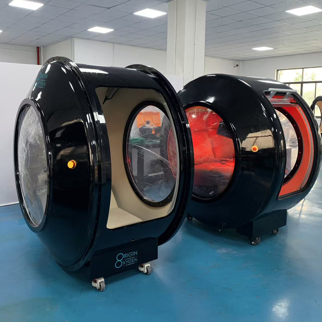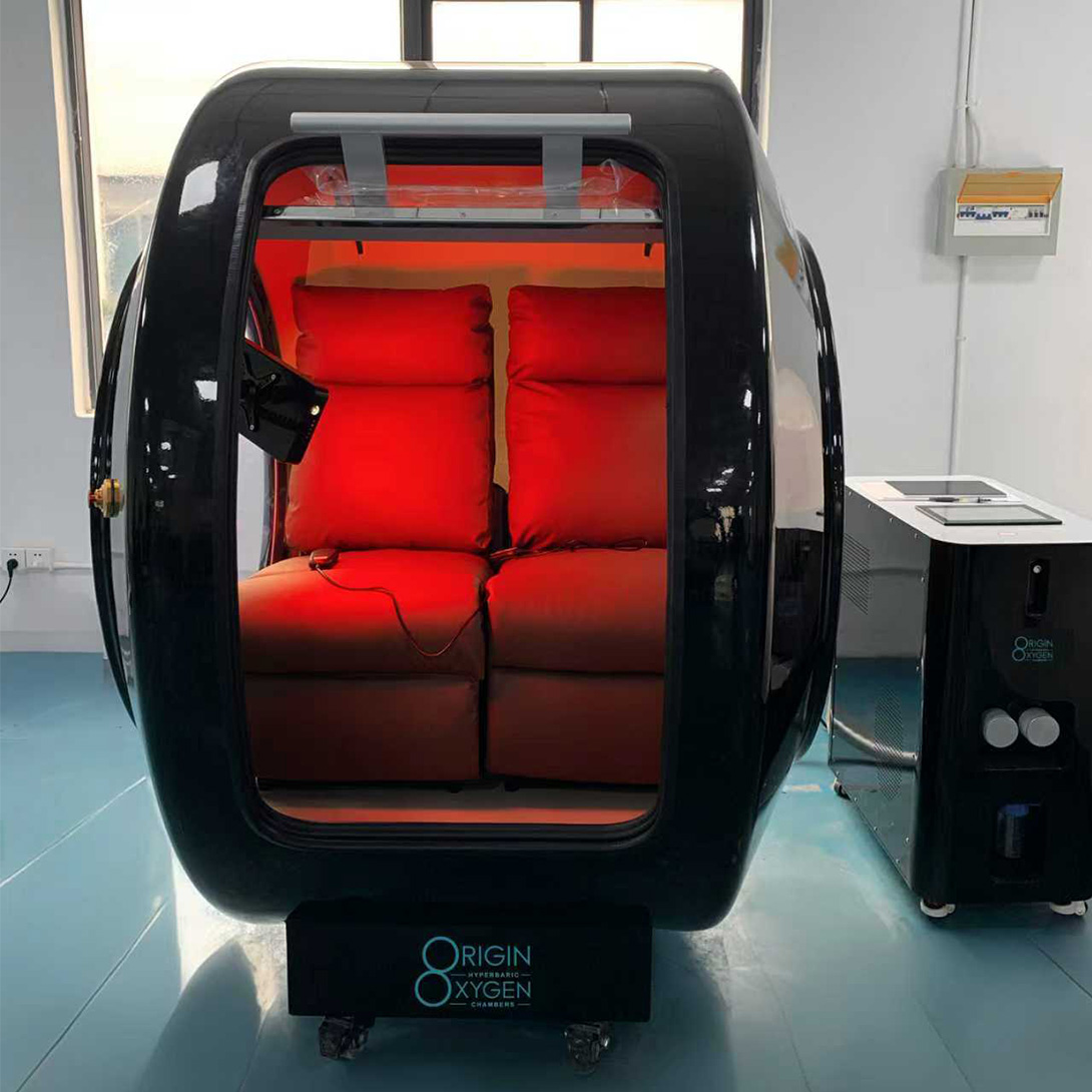 The open and spacious cabin features a clear front door and two large round windows, creating an inviting and light-filled atmosphere. Inside, two ergonomically designed reclining chairs allow both users to unwind and experience the therapeutic benefits of oxygen and red light therapy. Red light therapy complements the oxygen environment by supporting cellular regeneration, improving circulation, and reducing inflammation for enhanced wellbeing.