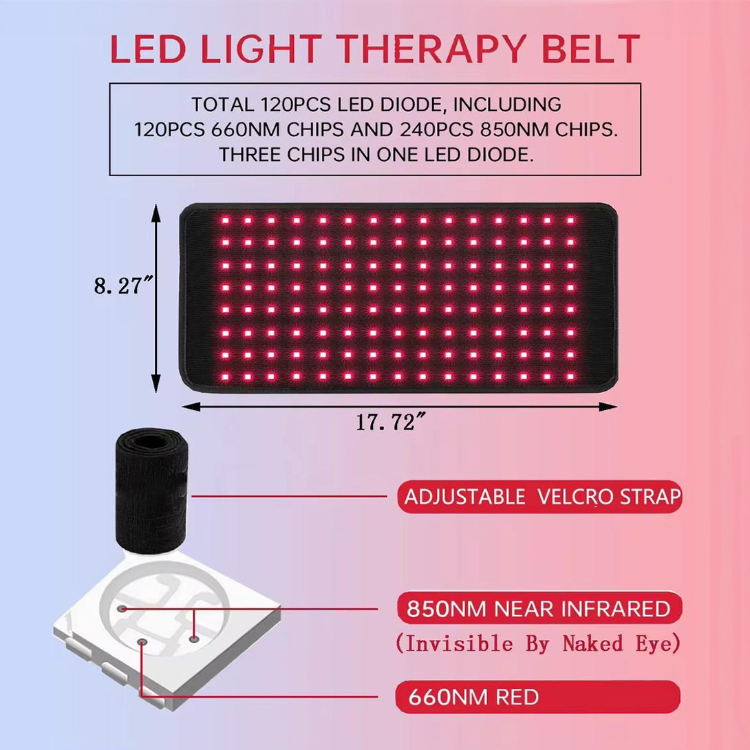 The belt features 72 high-quality LEDs delivering a blend of 660nm red light and 850nm near-infrared light. This dual-wavelength configuration ensures both surface-level and deep-tissue penetration, providing a broad therapeutic effect that supports circulation, cellular repair and pain reduction.