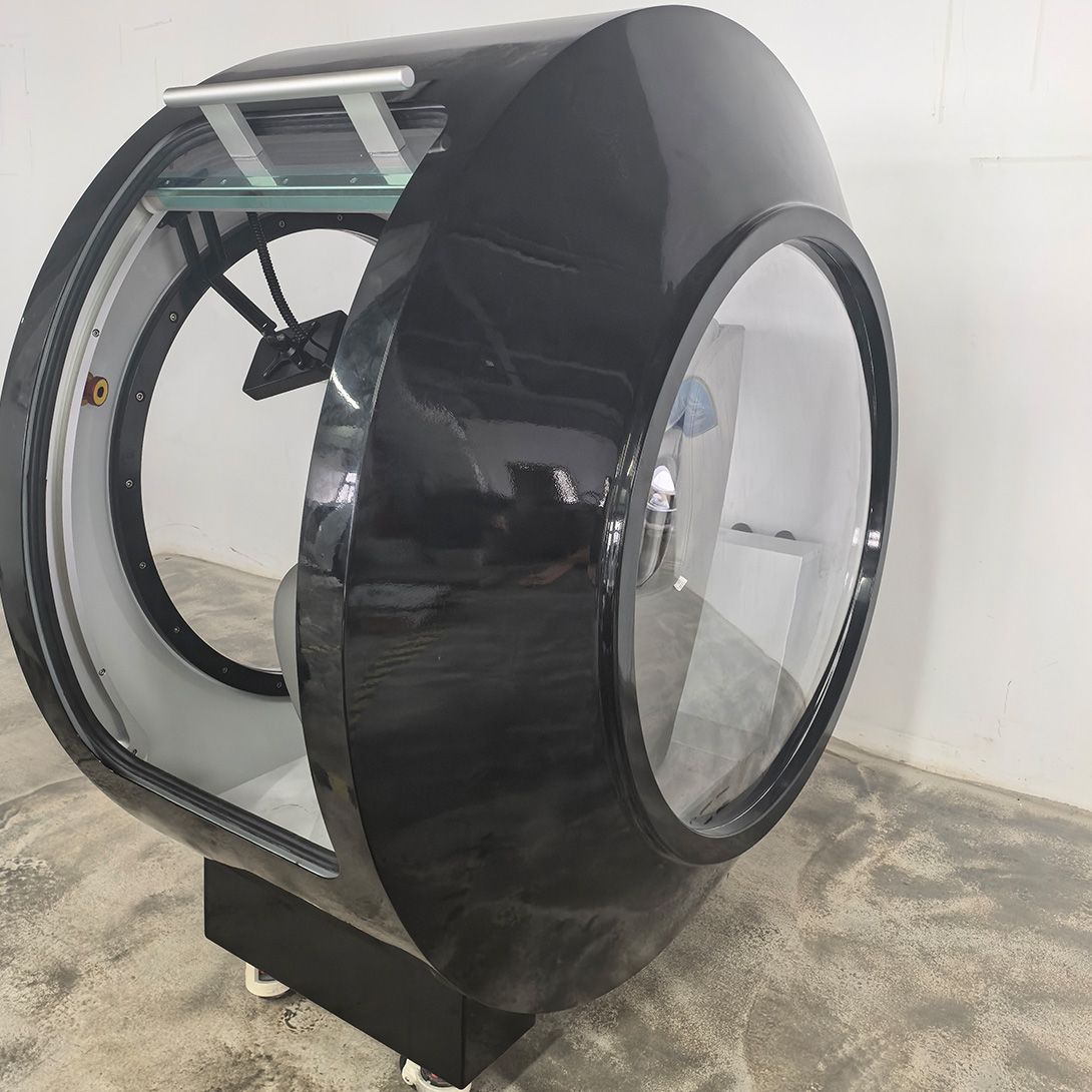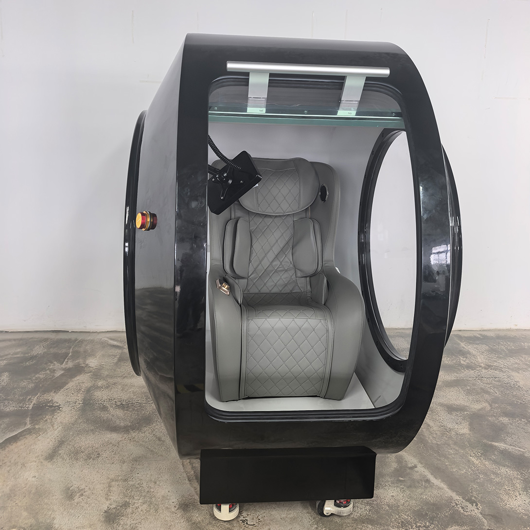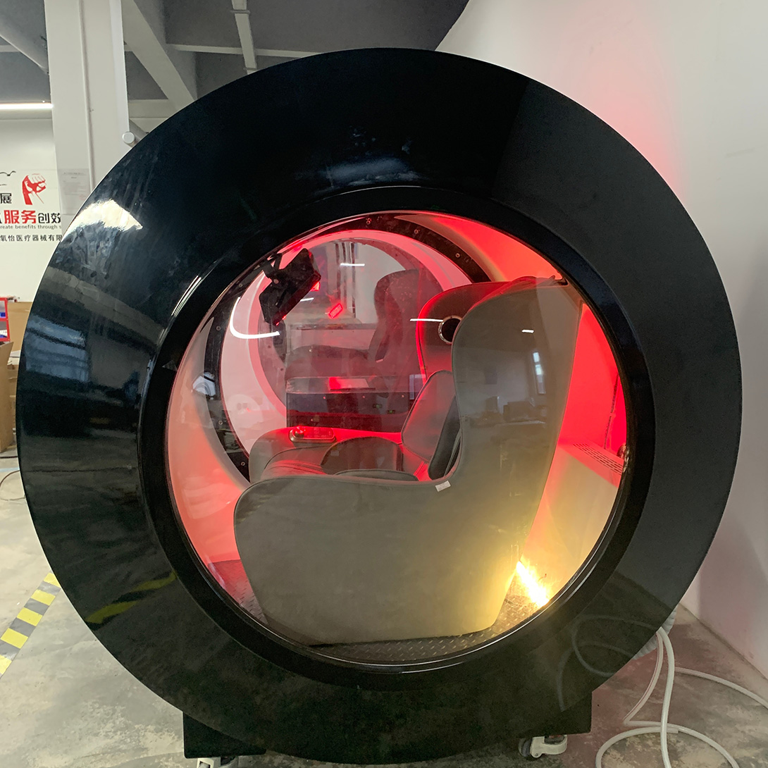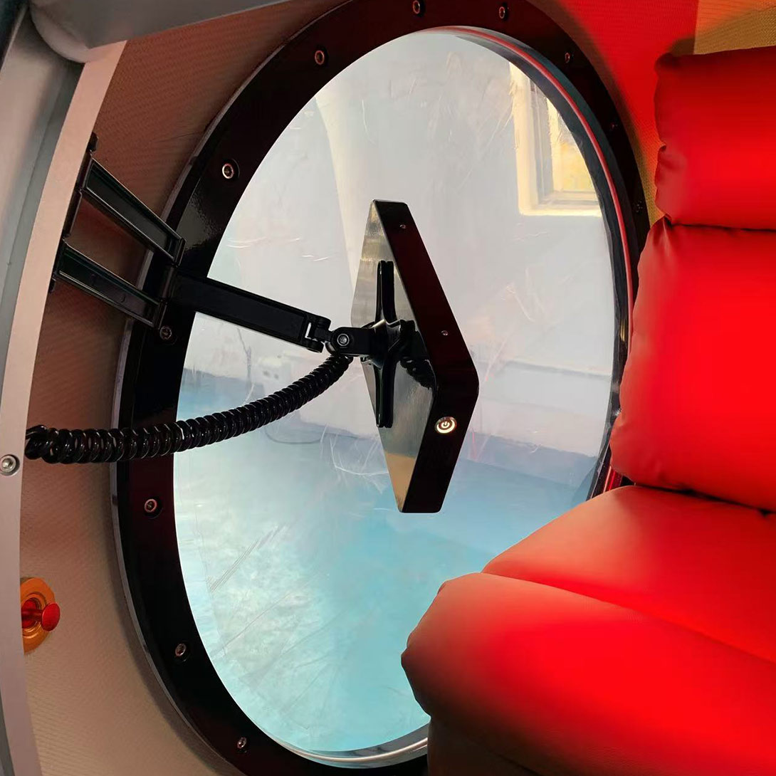 The chamber features an expansive interior that comfortably accommodates one user, enhanced by a clear front door and two large round windows that create a sense of openness and tranquillity. Inside, a fully reclining chair provides exceptional comfort throughout each session, while integrated red light therapy supports healing, circulation and overall vitality.