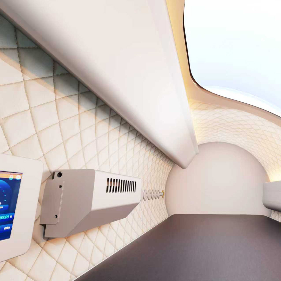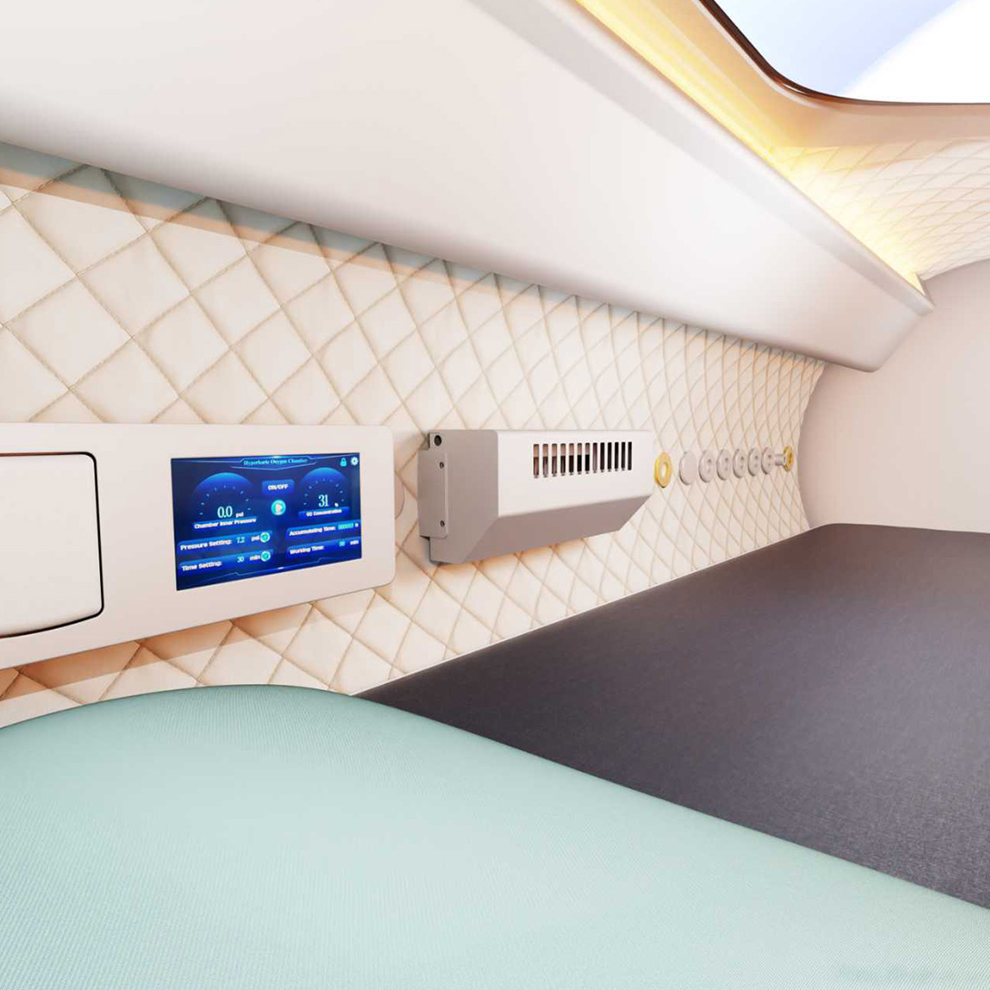 Operating between 1.3ATA (4.5psi) and 2.0ATA (14.5psi), the chamber provides optimal pressurisation to improve oxygen absorption, accelerate tissue repair, and enhance recovery. Dual intelligent touch screens — a 9-inch internal and a 13-inch external display — allow seamless operation, giving users full control inside and out.